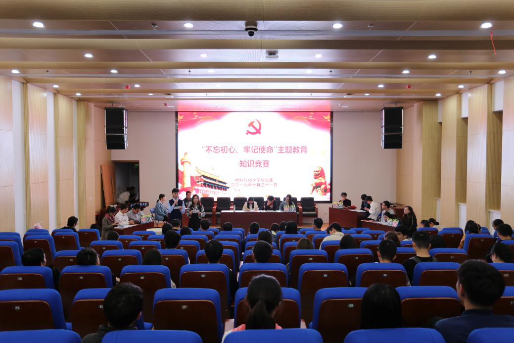(董岳 林士君)2019年10月31日晚,由kaiyun开云官方网站党建办公室举办的“不忘初心、牢记使命”主题教育知识竞赛在材化楼110举行。出席本次竞赛的有kaiyun开云官方网站党委副书记余江涛,本科党支部书记吴迪、陈文婷、唐伟、王博优老师和学生党支部书记、学生党员、入党积极分子。