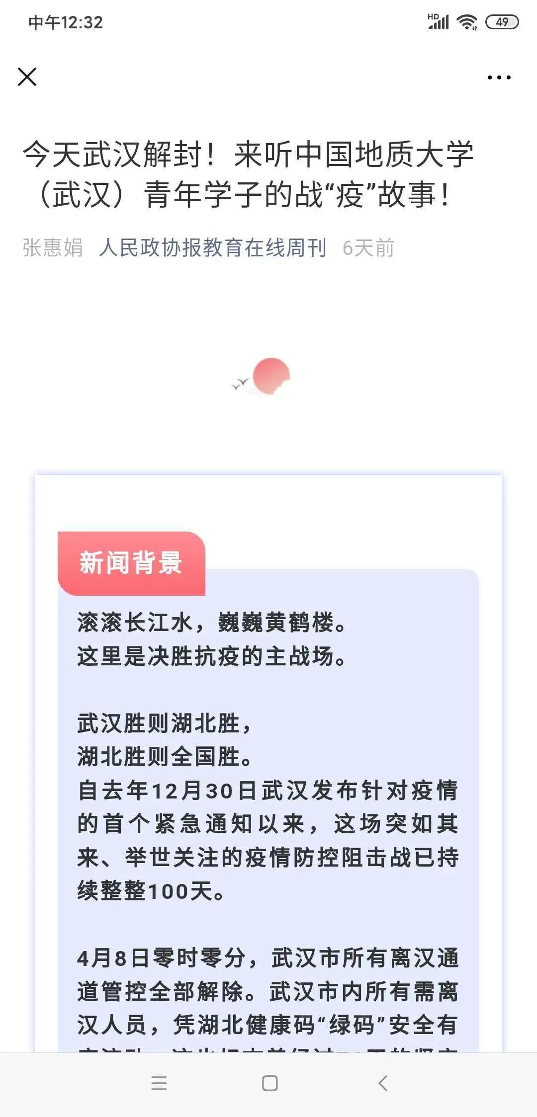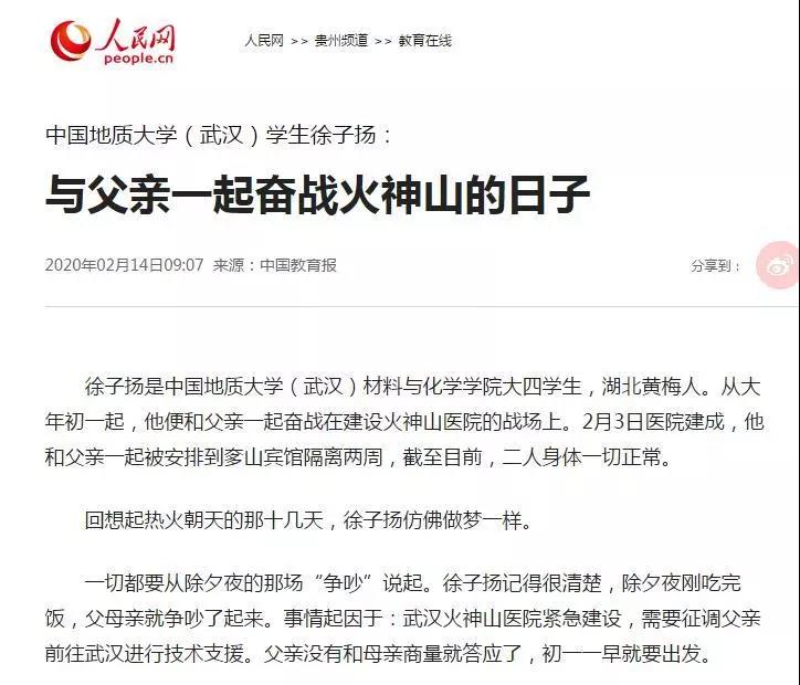 徐子扬,男,1998年5月出生,共青团员,kaiyun开云官方网站(武汉)kaiyun开云官方网站应用化学专业卓越计划班在读本科生。其事迹受到人民网(2月14日)、光明网(2月17日)、中国青年报(2月18日)、中国教育报(2月14日)、中国青年网(2月13日)、湖北日报(2月12日)等媒体广泛报道。