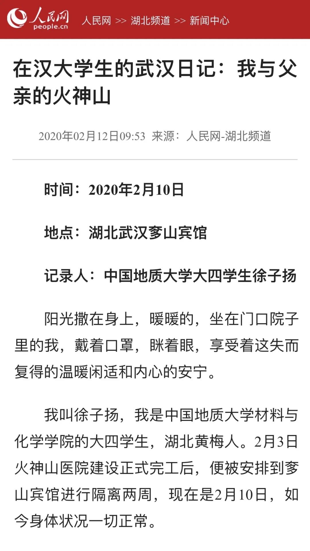 当徐子扬的事迹被媒体广泛报道之后,人人都夸赞徐子扬是当之无愧的“小英雄”时,他却说:“‘英雄’这样的称呼实在愧不敢当。在病毒肆虐的日子里,我经常在想我们青年人能够为这个国家做些什么?我只是做了一个青年人力所能及的事而已。”