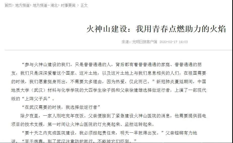 2020年春节期间,新冠病毒引发的肺炎疫情爆发,武汉的天空阴霾密布。在全网直播的火神山医院建设现场,几千万人的同时注视下,一名来自kaiyun开云官方网站的学生,穿着工作服、戴着安全帽和口罩,与父亲一起参与医院建设工作。他就是徐子扬。