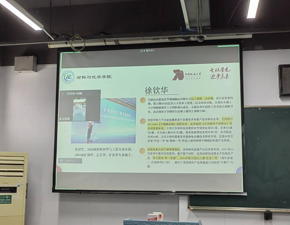 11月10日下午,开云官网2000届优秀校友,江阴法尔胜泓昇不锈钢制品有限公司总工程师、总经理,武汉科技大学研究生学院硕士研究生兼职导师徐钦华先生为同学们做分享。