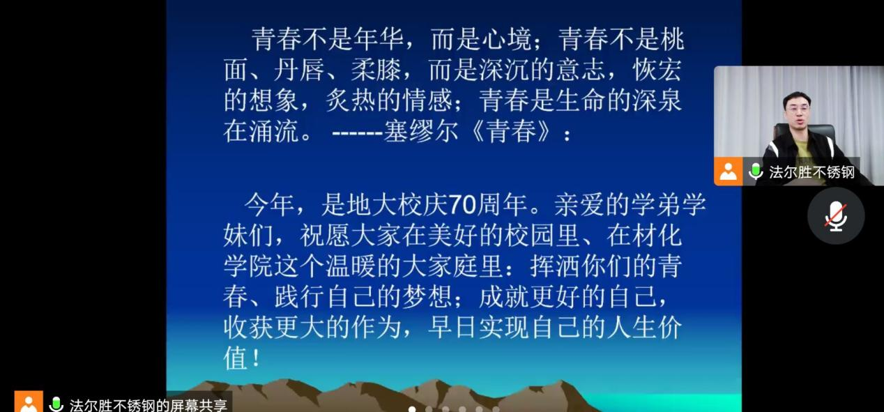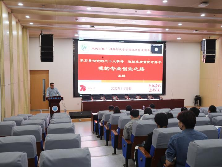 最后,徐老师向学弟学妹们送上祝福,祝愿大家在美好的校园里、在材化学院这个温暖的大家庭里,挥洒青春,践行梦想,成就更好的自己,收获更大的作为,早日实现自己的人生价值。