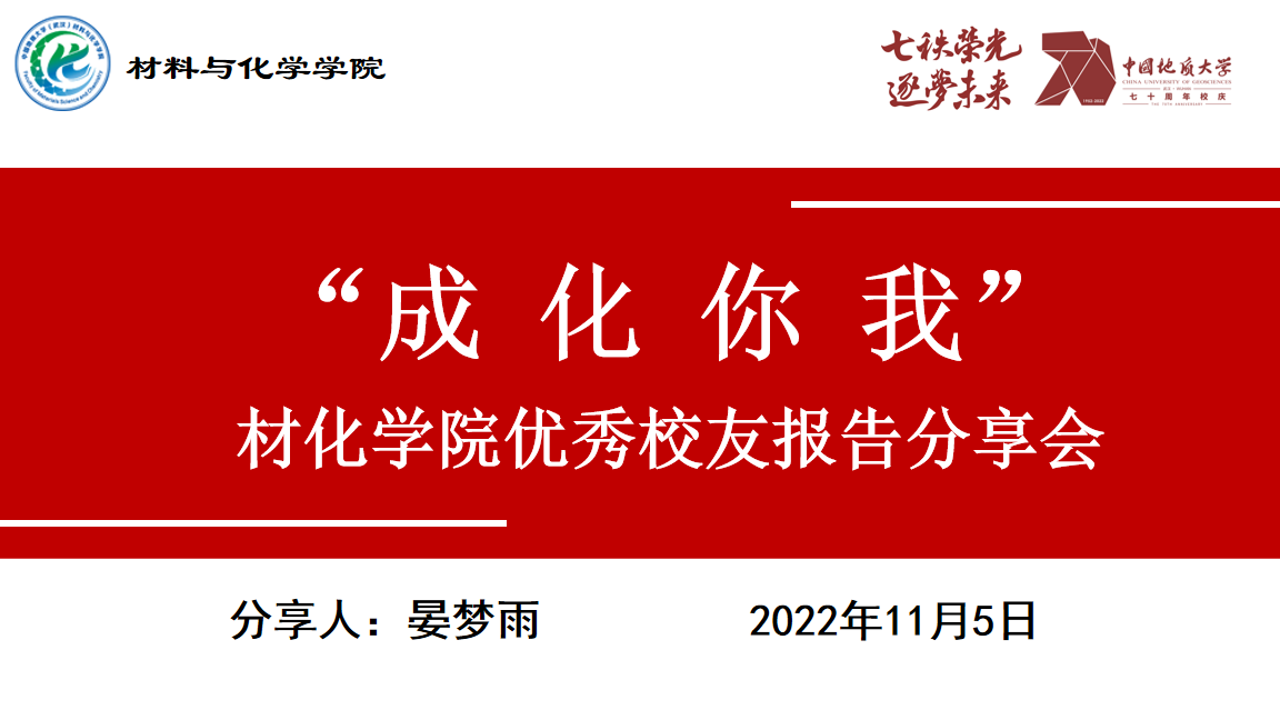 2022年11月7日,kaiyun开云官方网站(武汉)迎来了70周年校庆,为了保证校庆活动的顺利进行,展现七秩地大的风采与荣光,材化学院全院师生有条不紊的筹备了校庆的系列工作。与此同时,材化校友们心系母校、回归母校,为母校送上最真挚的祝福。