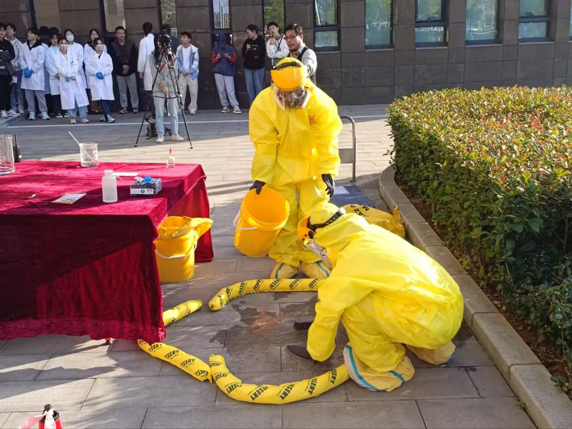 为进一步加强实验室安全管理,提升广大师生应对危险废弃物泄漏事故的处置能力,2024年11月7日下午,实验室与设备管理处联合材料与化学学院在未来城校区材化楼110报告厅组织开展了“2024年实验室危险废弃物泄漏事故应急演练”培训活动。实验室与设备管理处副处长翁华强、开云官网副院长夏开胜以及来自未来城校区各学院170余名师生参加演练培训,我院实验教学中心刘浴辉教授主持活动。 翁华强副处长介绍了学校每年部署开展“实验室安全宣传教育周系列活动”的背景和现实意义,同时也列举了近年来高校实验室安全事故的典型案例。他强调:安全的风险时刻都在,要时刻保持警惕,加强安全意识。他肯定了材料与化学学院近年来在人才培养、科学研究等领域中取得的优异成绩,希望大家进一步高度重视实验室安全管理,为事业发展提供坚强保障。 夏开胜副院长对实验室设备管理处及兄弟学院的大力支持表示衷心感谢,他指出:本次活动的主要目的是提升师生在面对危险废弃物泄漏事故时的应急处理能力。全体师生应牢记习近平总书记的教导,以时时放心不下的责任感,做好实验室安全这篇大文章。同时他也承诺,学院将以此次活动为契机,进一步完善安全预案,加强安全管理和培训,为师生营造一个安全有序的学习与科研环境。 安全工程师陈坚为师生们上了一堂生动详实的安全教育课,通过开篇引入、视频播放、有奖知识问答等数个环节将现场环境推向高潮。 随后,陈坚带领着参加活动的师生来到材化楼外进行现场实操演练,同学们穿上防护服,实景模仿演绎了丙酮在实验室泄漏的场景,并现场演示了应急处置方法。 通过生动且深刻的专题培训与危废事故应急实操演练,不仅增强了师生们对实验室安全重要性的认识,也进一步提高了师生在实验室突发事故的应急处置、紧急避险等能力,为构建安全和谐的校园环境打下了坚实基础。(编辑:刘浴辉、曾成;审稿:梁本哲)