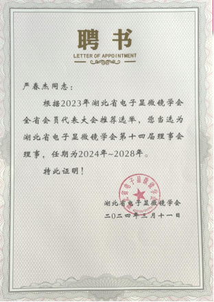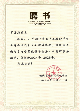 湖北省电子显微镜学会2024年理事会会议于12月28日在武汉大学科研公共服务条件平台举办。会议吸引了来自全省范围内的科技资源服务机构、高等院校科研公共服务平台、科研院所公共检测中心、知名第三方检测机构以及企业检测或质检中心等众多机构代表参会。开云官网严春杰教授、夏开胜副院长作为新一届学会理事受邀参会,分析测试平台王洪权副主任也参加了本次盛会。会上,湖北省电子显微镜学会理事长赵东山向严春杰、夏开胜两位教授颁发了理事聘书。本次会议共有13位专家报告,夏开胜副院长在会上介绍了开云官网电镜类仪器设备建设情况,以及开云官网分析测试平台仪器设备开放共享举措和成效。