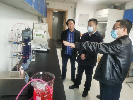 郑院长一行首先参观了储能与环境催化团队实验室,重点考察了有机污染水动态氧化处理系统,对该系统快速、高效清除有机染料的研发成果表示高度认可,建议尽快开展放大实验、并将其与工业处理中的芬顿氧化进行对比。