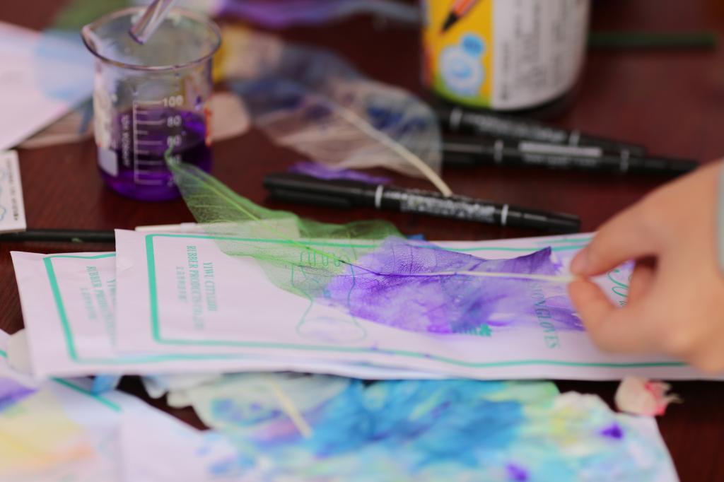 “叶脉书签”团队现场在校园里收集飘落的树叶,利用热的碱性溶液对叶肉进行腐化剥离,只留存坚硬的叶脉,加以染色塑封,就可以得到一件个性十足的叶脉书签。
