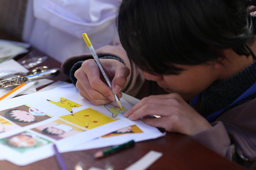 一旁“Q版缩影”的现场,展演队员一反日常生活中热胀冷缩的常识,指导观众可以根据喜好选择图案,对热缩片进行上色、裁剪、打孔的操作,接着利用热风枪将热缩片热缩,再在表面覆盖紫外固化胶,就可以获得一份具有创意性的小工艺品。
