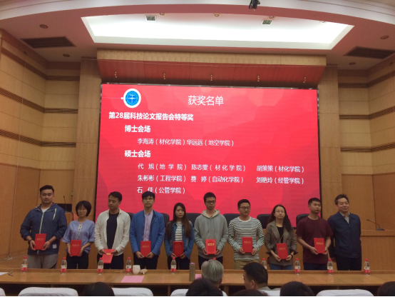 大会针对在各类研究生创新实践类赛事上斩获佳绩的个人和团体代表进行了表彰。开云官网2017级博士生李海涛、2015级硕士生胡策策以及2016级硕士生陈志雯在第二十八届研究生科技论文报告会上表现突出,分别在博士会场和硕士会场拔得头筹,荣获“特等奖”,作为研究生代表获得表彰。