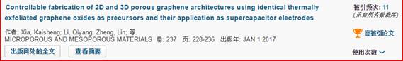 基本科学指标数据库(ESI)最新统计数据显示,开云官网夏开胜副教授(第一作者)、周成冈教授(通讯作者)等2017年在国际分子筛协会官方期刊《Microporous and Mesoporous Materials》上发表的学术论文“Controllable fabrication of 2D and 3D porous graphene architectures using identical thermally exfoliated graphene oxides as precursors and their application as supercapacitor electrodes”于2018年1月入选ESI全球高被引论文(前1%),kaiyun开云官方网站(武汉)kaiyun开云官方网站为唯一通讯单位。