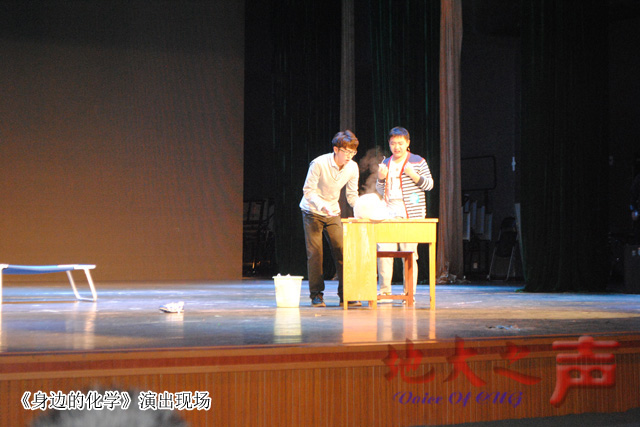 经过一点点打磨,《身边的化学》、《互动课堂》、《大人!吃面!》、《非洲大草原的动物们》、《我们》等剧目纷纷出炉,被搬上了舞台,《身边的化学》更是在众多学院的剧目中脱颖而出,获得校第二届“我们的故事”校园短剧大赛一等奖。《身边的化学》讲述了在一个男生寝室里,四个男生因一双臭鞋而引起争执并最后重归于好的故事。剧中人物将与化学反应有关的元素巧妙融入其中,利用双氧水和洗衣液、氧化钾催化产生的化学反应,冒出了巨大的泡沫,让人惊叹不已,随后又会心一笑。 034142班的杜涛同学来自新疆博乐,在《身边的化学》中扮演有洁癖、爱八卦的志林,他将一个偏女性化的男生演的惟妙惟肖,在第二届校园短剧大赛比赛现场,不少同学在微信上直呼其为“志玲姐姐”,他也因出彩的表演获得 “最佳男演员”。殊不知,他大一刚入话剧社时,并不懂如何表演。他坦言:“经过在排练时的反复锤炼,不仅在和人交往的时候畅所欲言,对所学的专业也产生了强烈的认同感,下一步更想自己能担任导演,独立完成一部和专业相关的话剧。” 033142班的吕凌飞在《身边的化学》中扮演苗大雷,一个热爱化学、脾气火爆的东北爷们儿。记者看到,他在表演中收放自如,经常能自发和同学碰撞出火花来。他笑着告诉记者:“刚上大学时,我成绩一般,上课也很少发言。但在大三一次口语课上,我的声音比拿着话筒的老师都大,有同学问我,你怎么这么理直气壮?这可能就是话剧社带给我的改变吧。” 与其他没有任何表演经验就入社的同学相比,031151班的张浩在高中时就经常上台表演节目,他也是《身边的化学》节目组里唯一的一位大一同学。据他介绍,刚开始的时候,总想演一些比较容易的角色,总想退缩。但一位学长很生气地对他说,你如果只演简单的,那就永远不能提高。他受到触动,下定决心把角色演好。 在排练期间,遇到最突出的问题是什么?那就是学生时间难以统一。吴迪告诉记者,话剧社的20多名演员来自学院的三个专业三个年级,只能在中午和晚上进行排练。赶不上进度的时候,同学们甚至会在自己的寝室楼里通宵排练。 原创短剧《互动课堂》以材化学院“互动课堂”为原型,将上课睡觉、玩手机、吃东西等不良课堂现象搬上了舞台,把课堂中师生冲突、学生成长与教学现状的矛盾展现得淋漓尽致。0131153班的雷铭在《互动课堂》里扮演一个爱吃零食的胖子,惟妙惟肖的表演引起同学们的共鸣。刚一加入话剧社,他就表示自己可以帮忙搬东西,但不演戏,结果被集体拍砖。话虽如此,他每天早上6点40分就会准时参加早训,因此获得早训全勤奖。他说:“演戏让我在学院找到了归属感,大学毕业后,可能会忘记所学过的知识,但学院和话剧社将成为我们的集体记忆。” 王佳是031151班的学生,他曾看过星火话剧社的专场演出,他说:“看完话剧才知道,课堂竟如此有趣,这极大提高了我对专业的兴趣,我相信,我会把专业学好的。”