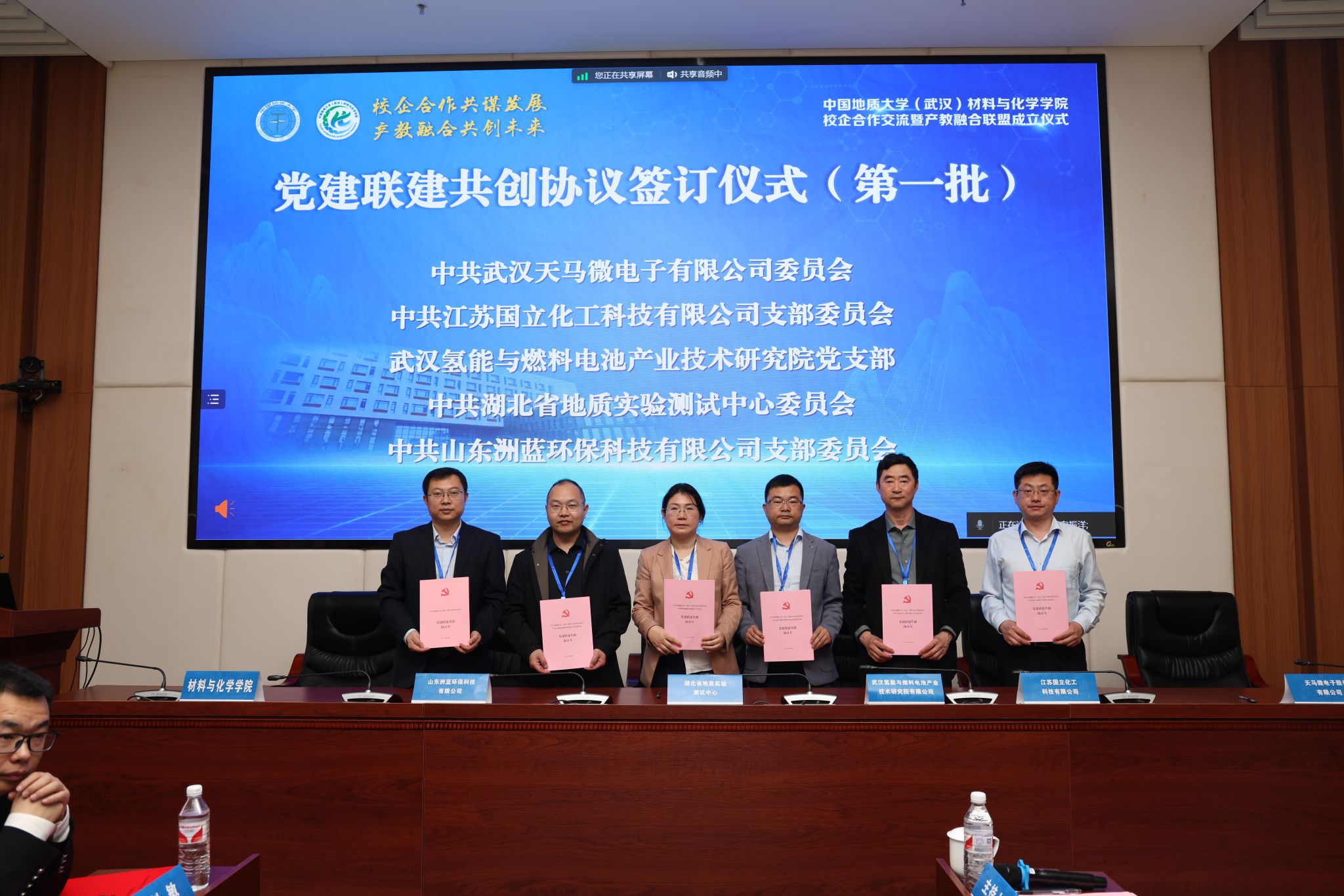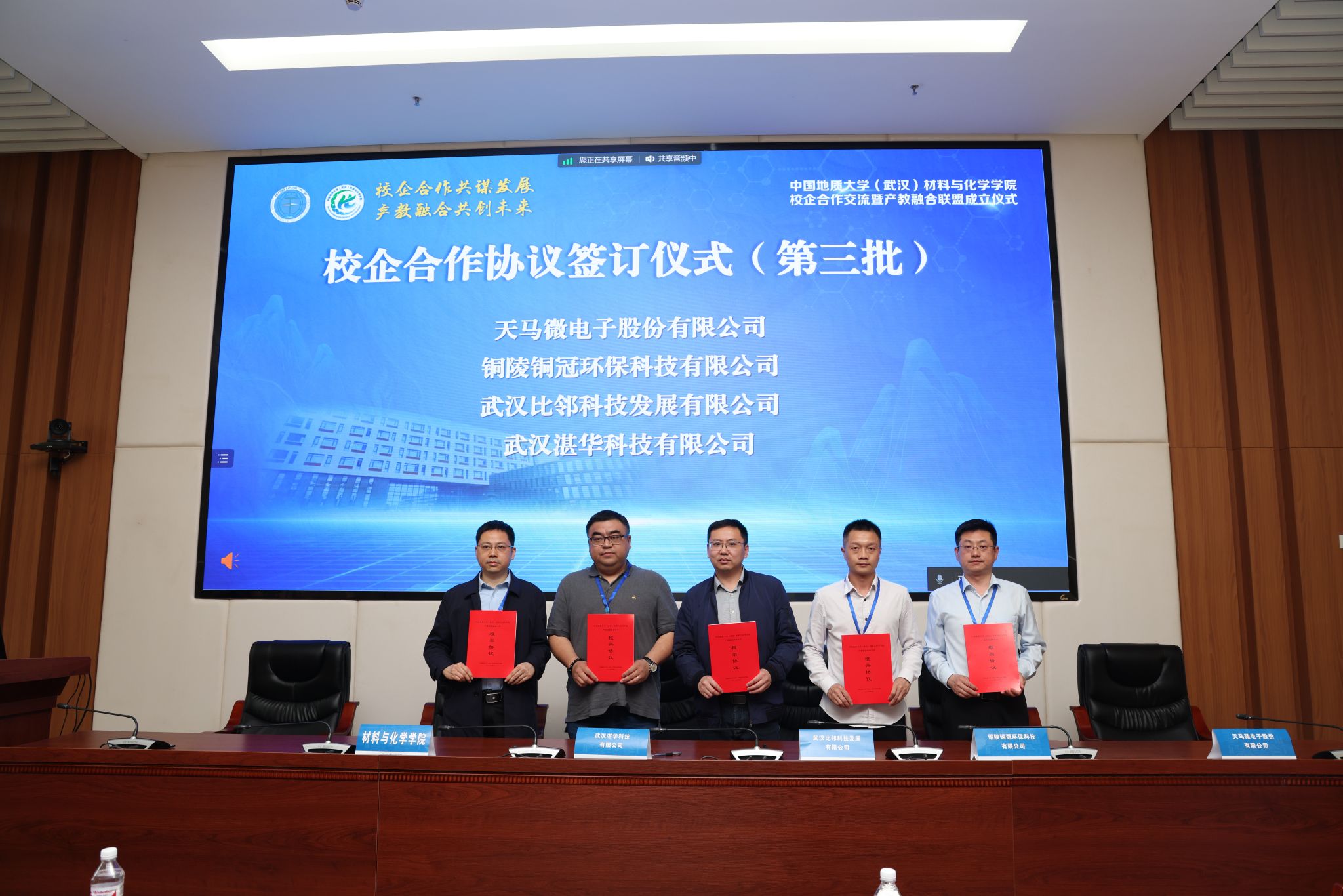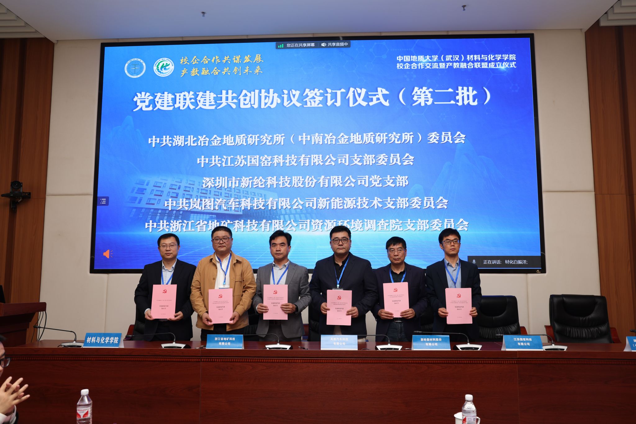 材化学院党委书记梁本哲与10家企业代表签署党建联建共创协议。胡兆初与19家企业代表签署校企合作协议,并为23家企业授学生实践教育基地铜牌。