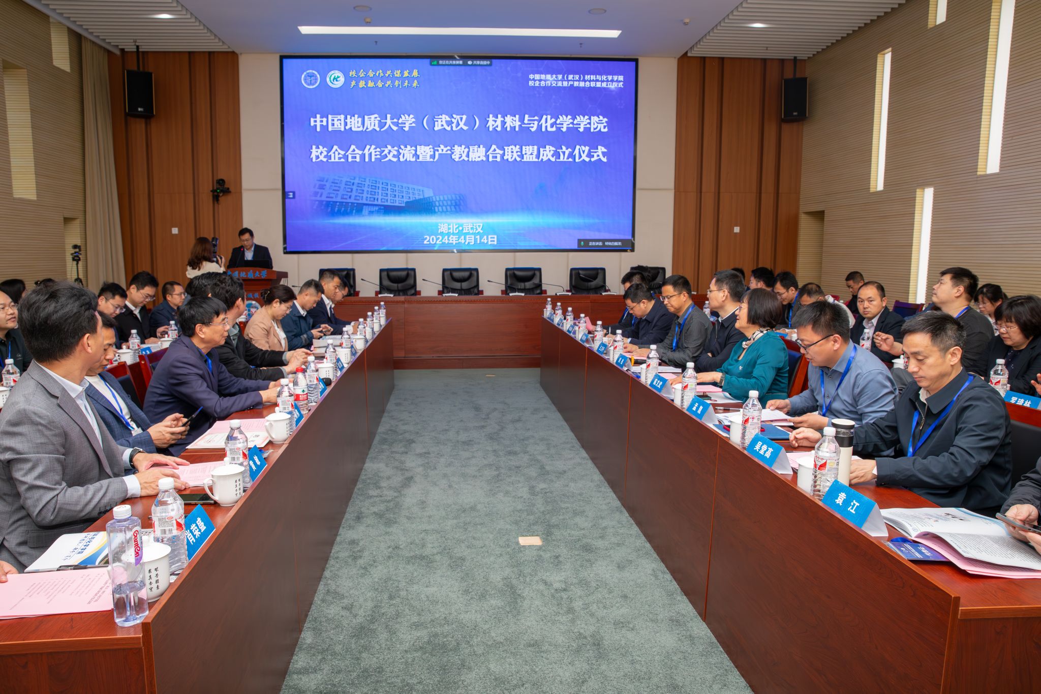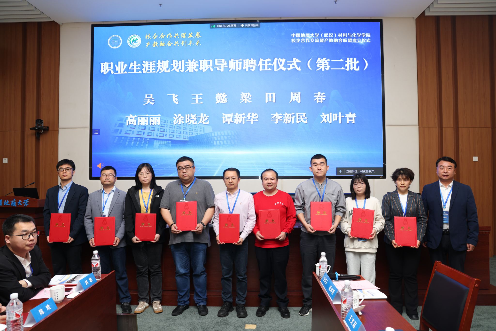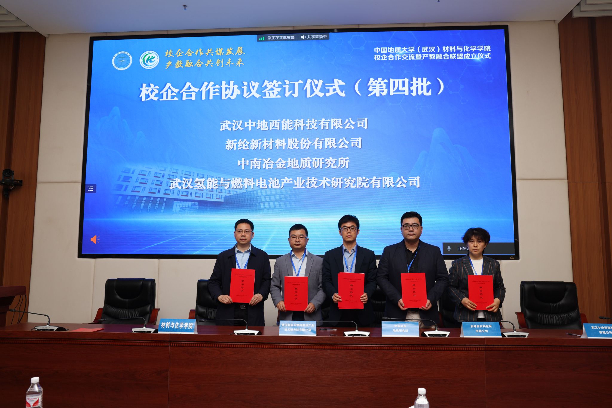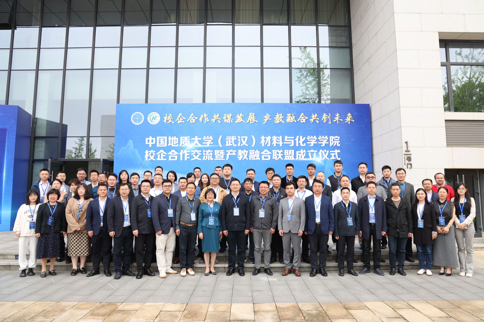 材化学院党委书记梁本哲与10家企业代表签署党建联建共创协议。胡兆初与19家企业代表签署校企合作协议,并为23家企业授学生实践教育基地铜牌。