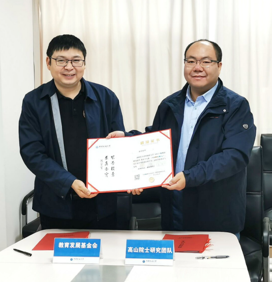 2022年10月7日,捐赠仪式在校友与社会合作处举行,学校教育发展基金会秘书长陈华荣与高山院士研究团队代表李明老师签署捐赠协议。